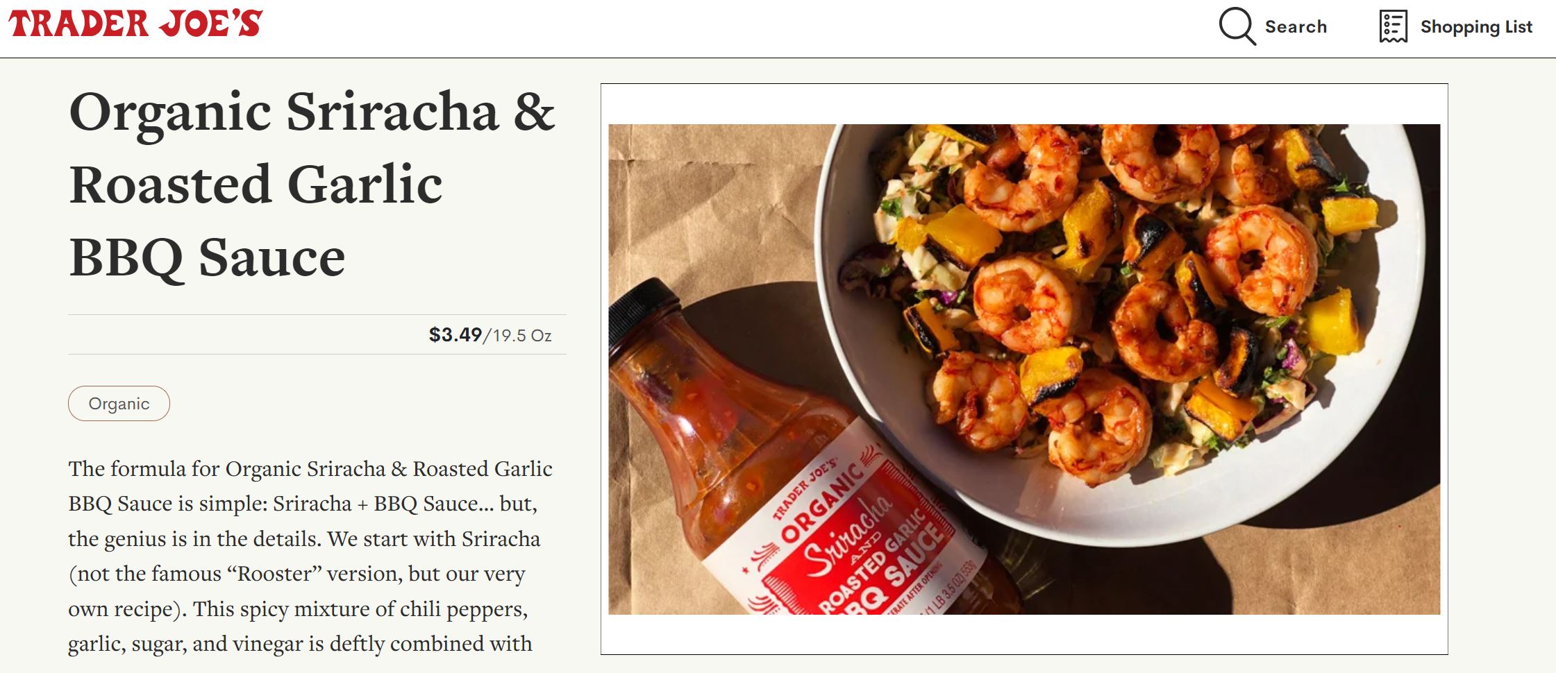 트레이더 조의 스리라차와 구운 마늘의 풍부하고 고소한 맛을 결합한 구운 마늘 BBQ 소스는 전통적인 레갈 소스의 다육질적인 반전입니다. 캐리커처, 펑크 또는 버거에 발라먹기에 완벽합니다. 이 소스의 독특한 맛 프로필은 또한 잔치를 위한 훌륭한 딥(dip)이나 피자를 위한 과감한 비트(beating)가 됩니다.