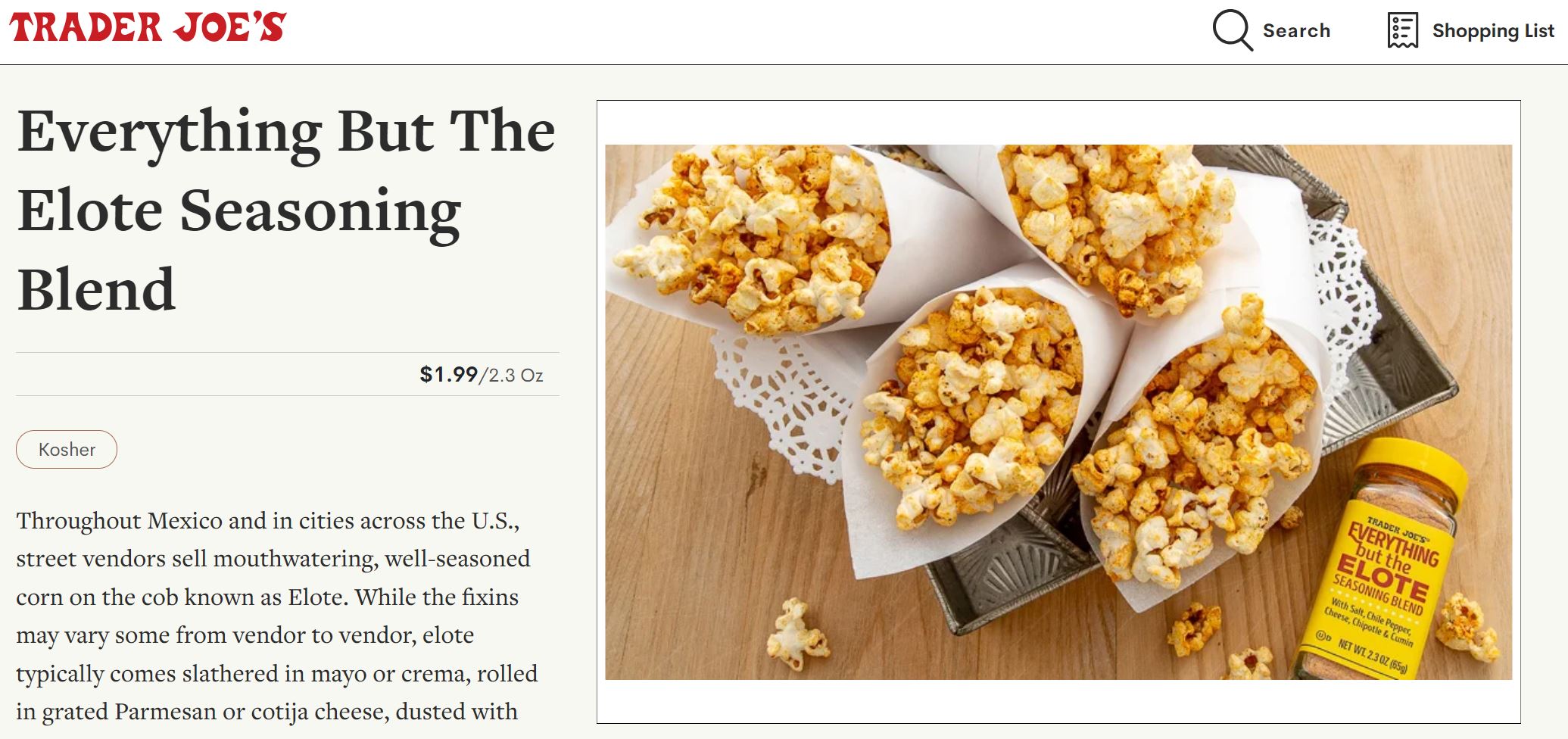인기 있는 멕시코 도로 슬러지에서 영감을 받은 트레이더 조의 에브리띵 벗 더 엘로테 시즈닝 블렌드는 엘로테의 맛을 여러분의 집으로 바로 가져다 줍니다. 멕시칸 요리를 좋아하거나 이국적인 향신료를 좋아하신다면, 하나쯤은 맛 보시면 좋을 것 같습니다. 고추, 치폴레 및 큐민이 포함되어 구운 야채 또는 팝콘에 튀기기에 완벽합니다.