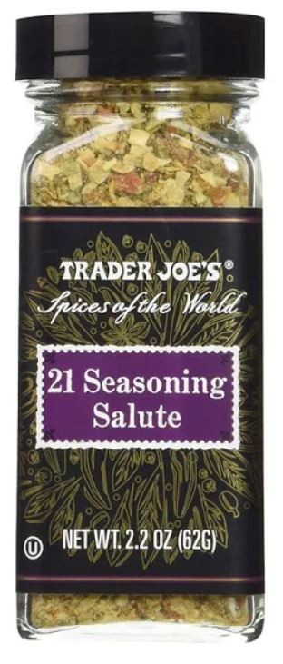 트레이더 조의 21 Seasoning Salute는 양파, 후추, 셀러리 씨, 카이엔 고추, 파슬리, 바질, 마조람, 월계수 잎, 오레가노, 타임, 세이보리, 로즈마리, 커민, 머스타드, 고수풀, 마늘, 당근, 오렌지 껍질 등 21가지 향신료와 소스 블렌드입니다. 스테이크를 구울때, 고기 잡내를 잡을 때, 스튜, 샐러드 등에 풍미를 더하기에 완벽합니다. 시즈닝을 손바닥에 뿌린 다음 손가락 끝으로 향신료를 부수어 에센셜 오일이 나오도록 하면 풍미를 더욱 높일 수 있습니다. 집에서 스테이크 요리를 즐기거나, 이국적인 향신료를 좋아하신다면 추천합니다.